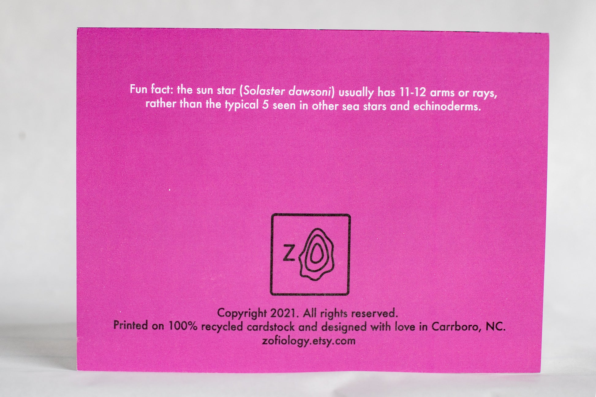 Hand-drawn digital image of a sun star with the phrase "hope this sun lap is off to a great start Happy Belated Birthday" printed to a 100% recycled greeting card. The card is blank inside, measures 7 x 5 inches, and comes with a matching A7 envelope (also 100% recycled!). The words "HAPPY BELATED BIRTHDAY!" are foiled onto the card. To reduce plastic pollution, these cards are wrapped in biodegradable materials rather than cellophane.