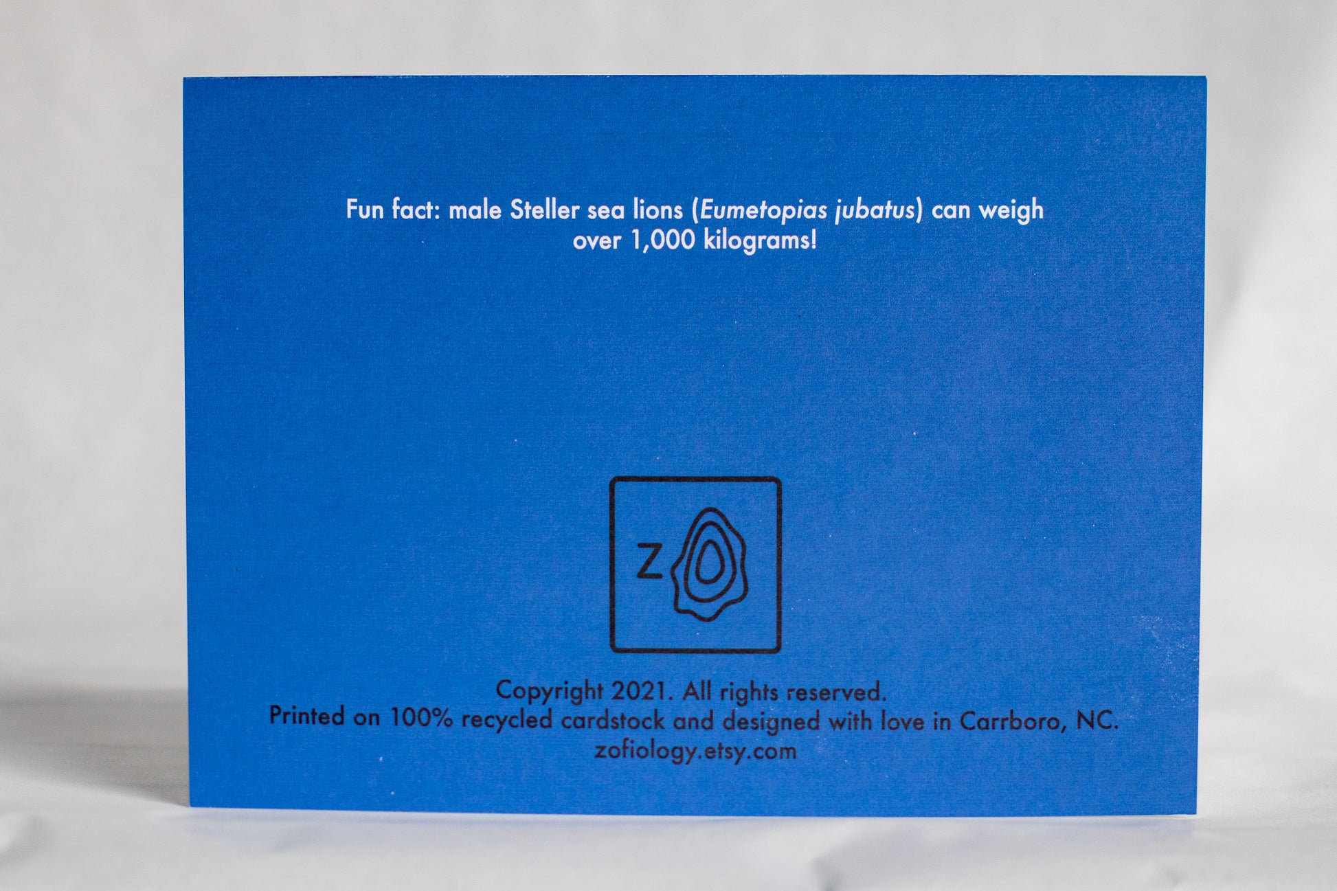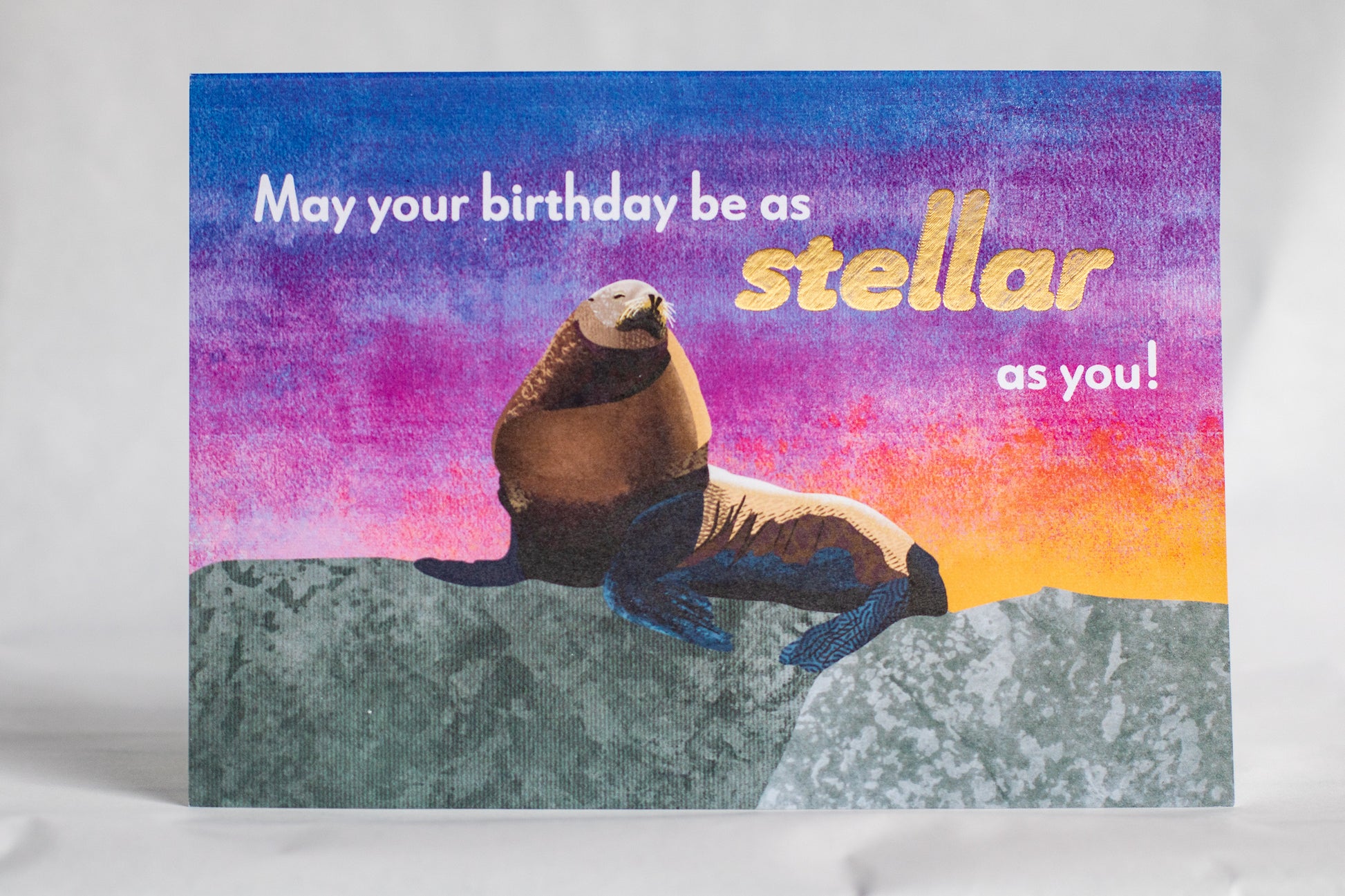 Hand-drawn digital image of a stellar sea lion with the phrase "hope your birthday is as stellar as you!" printed to a 100% recycled greeting card. Blank inside. The card is blank inside, measures 7 x 5 inches, and comes with a matching A7 envelope (also 100% recycled!). The word "stellar" is foiled onto the card. To reduce plastic pollution, these cards are wrapped in biodegradable materials rather than cellophane.