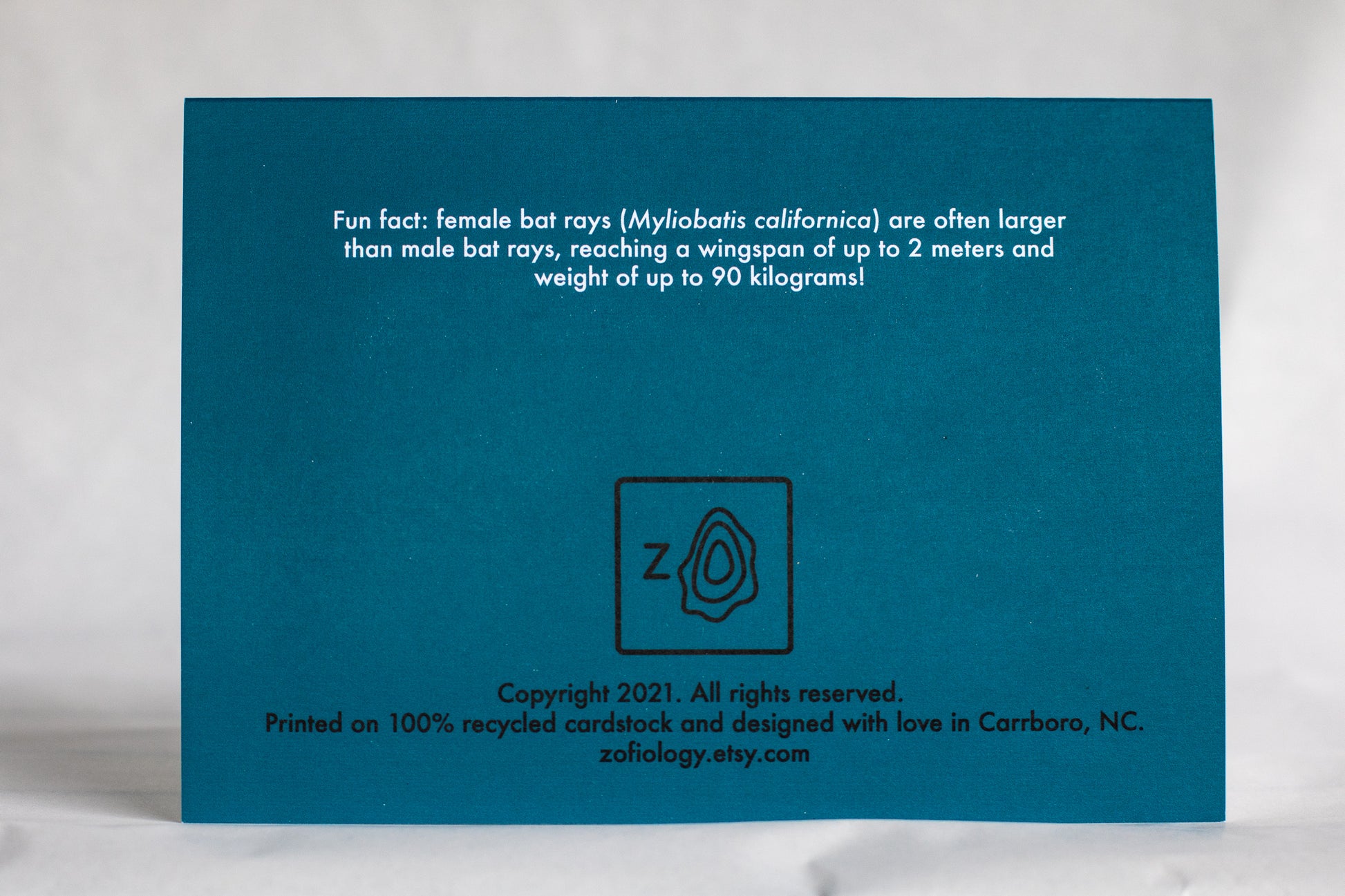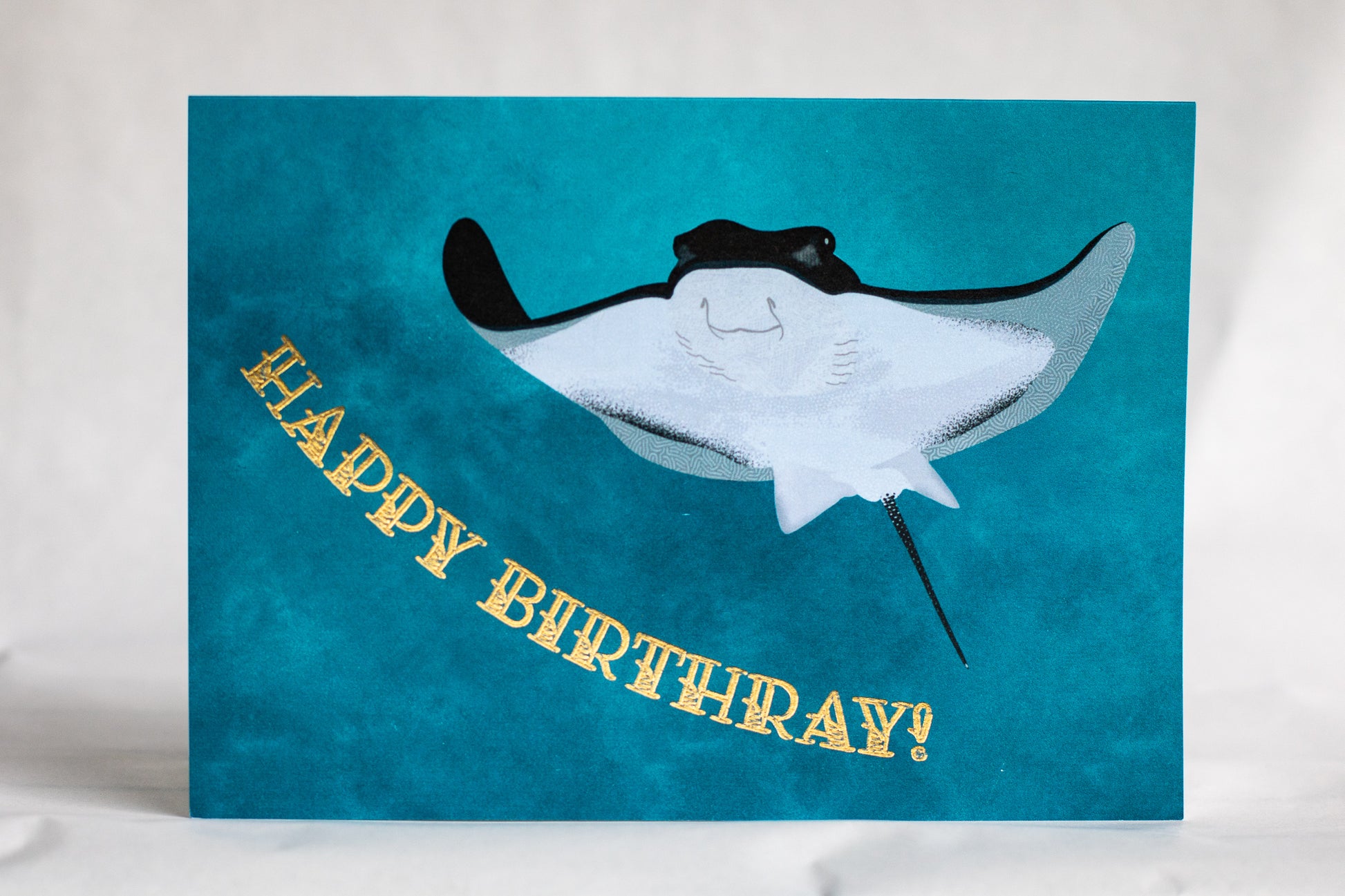 Hand-drawn digital image of a bat ray with the phrase "happy birthray!" foiled to a 100% recycled greeting card. The card is blank inside, measures 7 x 5 inches, and comes with a matching A7 envelope (also 100% recycled!). To reduce plastic pollution, these cards are wrapped in biodegradable materials rather than cellophane.