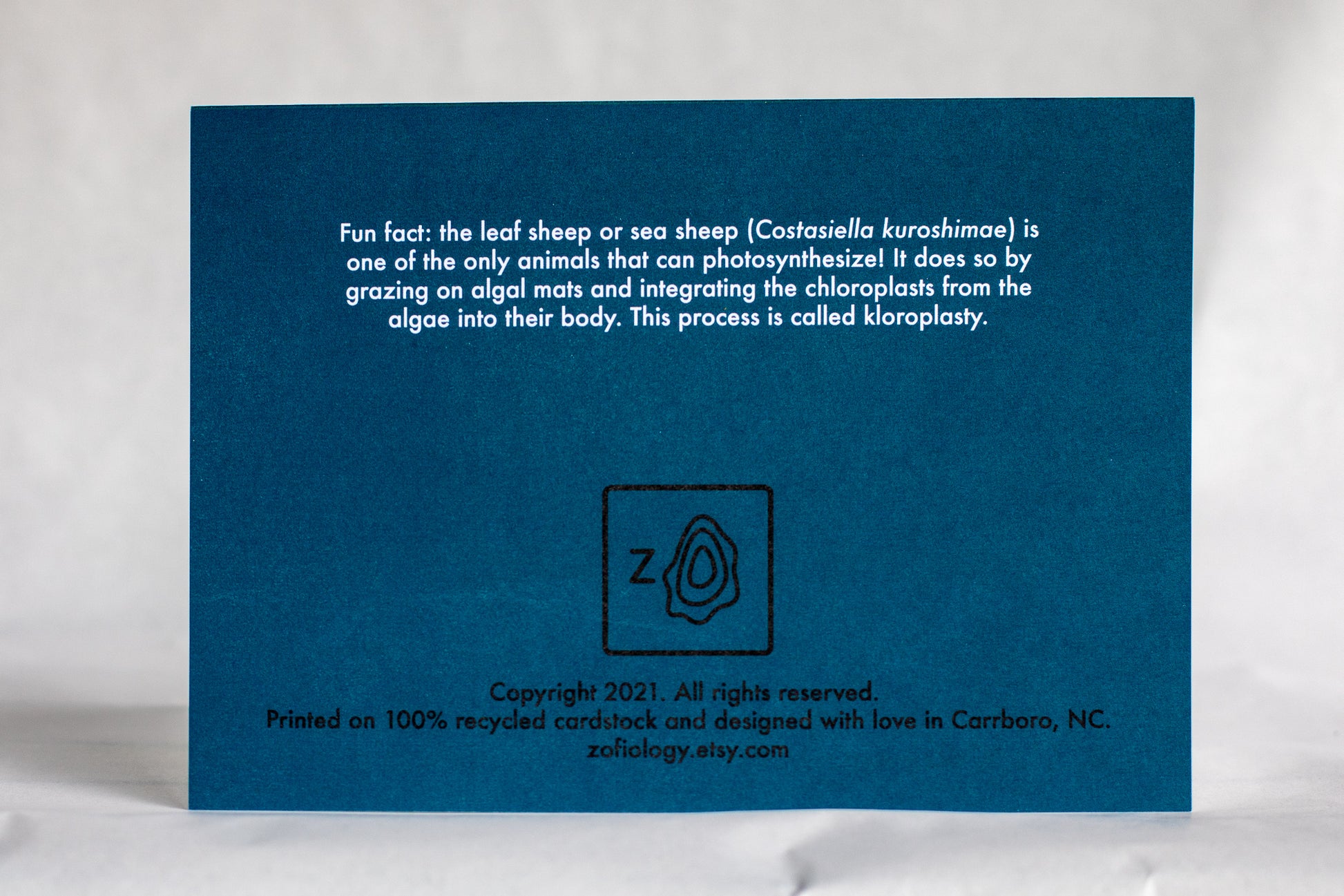 Hand-drawn digital image of a leaf sheep nudibranch with the phrase "sheepishly, I must admit that you're a total snack" printed to a 100% recycled greeting card. The card is blank inside, measures 7 x 5 inches, and comes with a matching A7 envelope (also 100% recycled!). The word "snack" is foiled onto the card. To reduce plastic pollution, these cards are wrapped in biodegradable materials rather than cellophane.