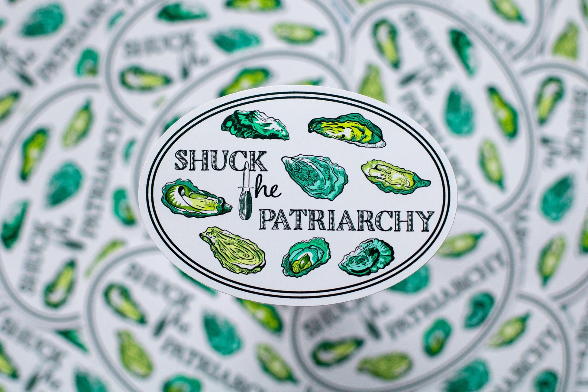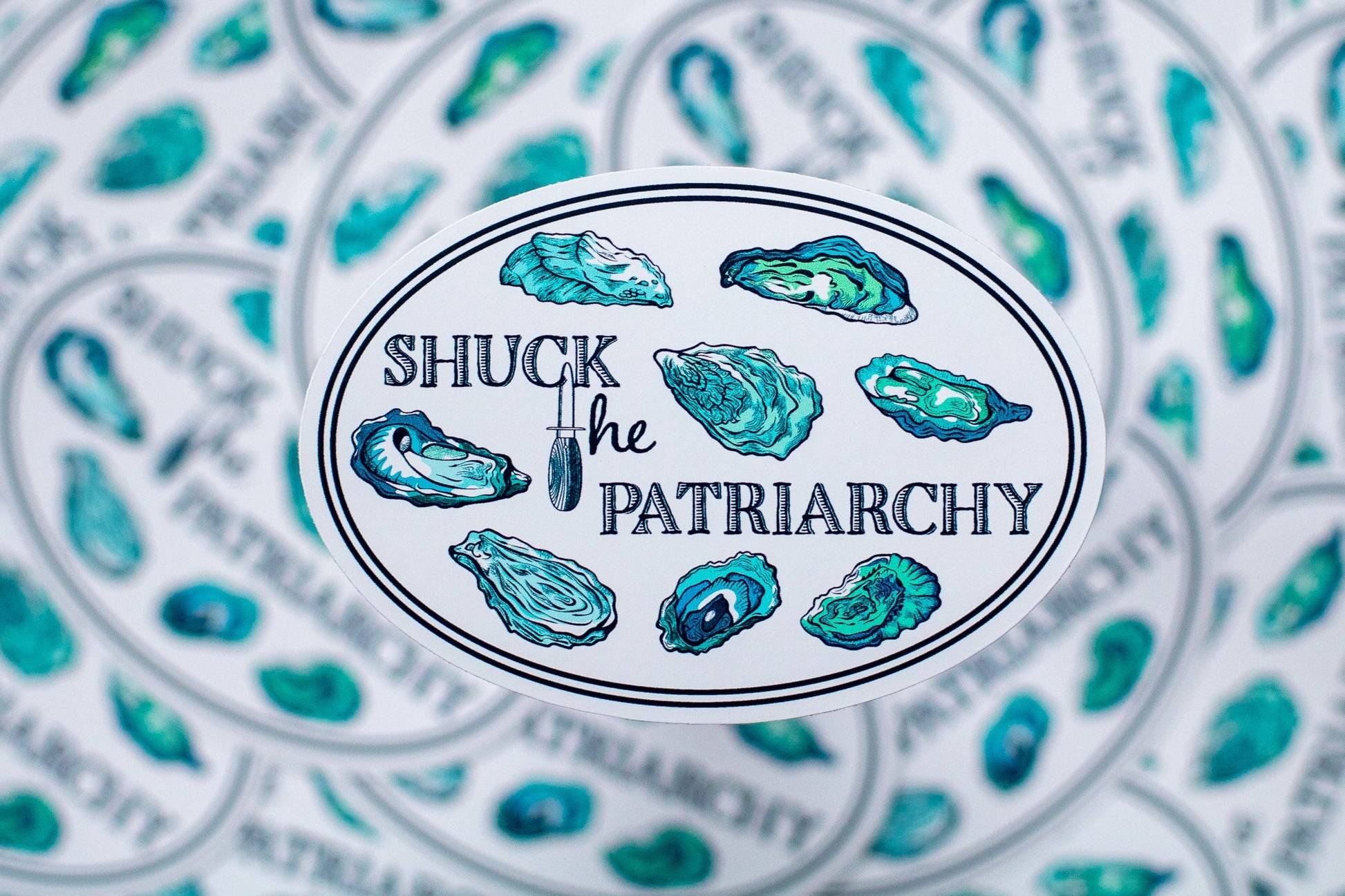 4 inch waterproof vinyl sticker with multicolored oysters and the words SHUCK THE PATRIARCHY. Set of 6 stickers includes blue, teal, green, purple, orange, and pink. Perfect laptop decal, car bumper sticker, water bottle sticker, etc. A great gift for anyone in your life who wants to tell the patriarchy to "shuck off" without opening their mouths!