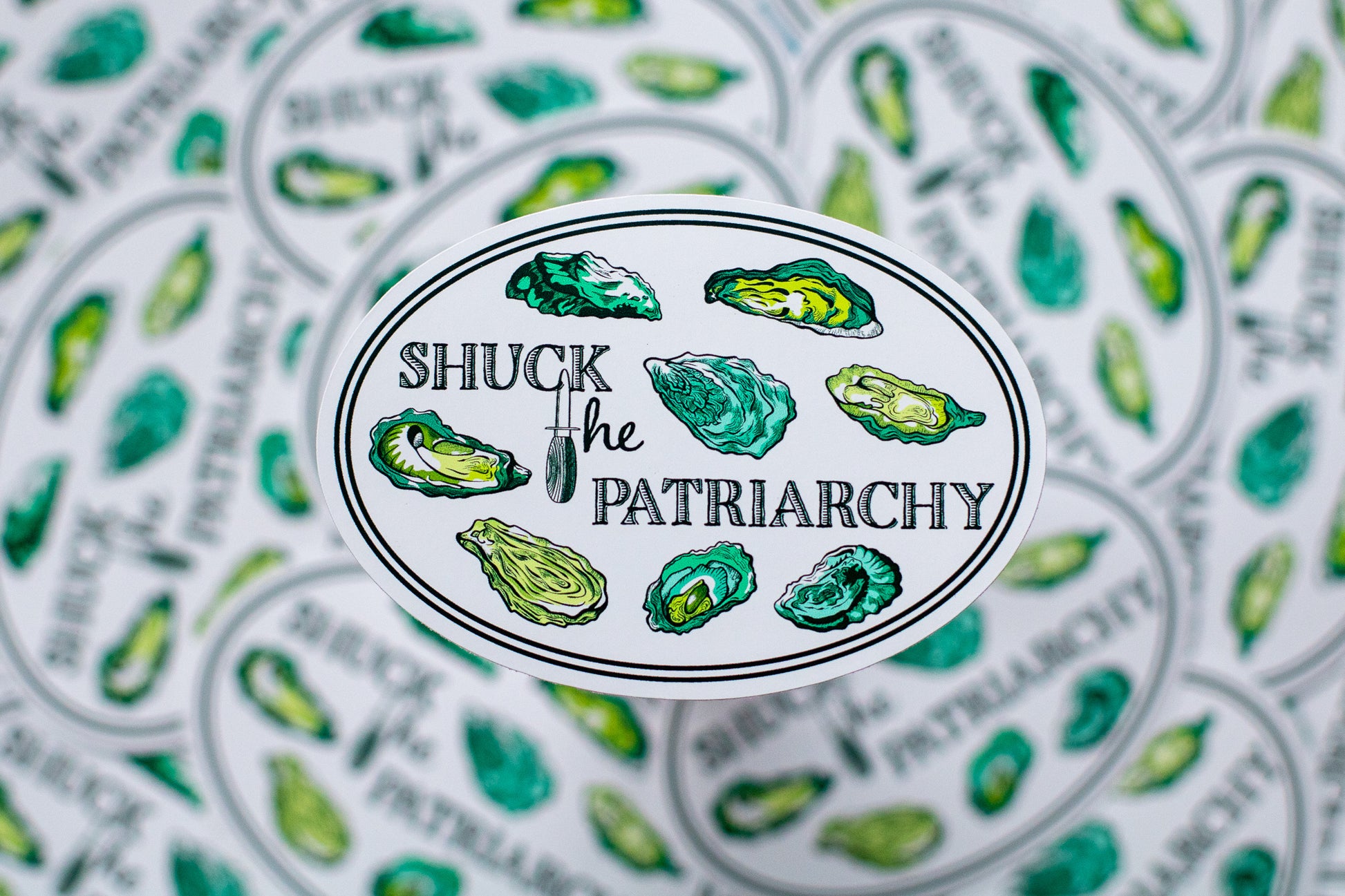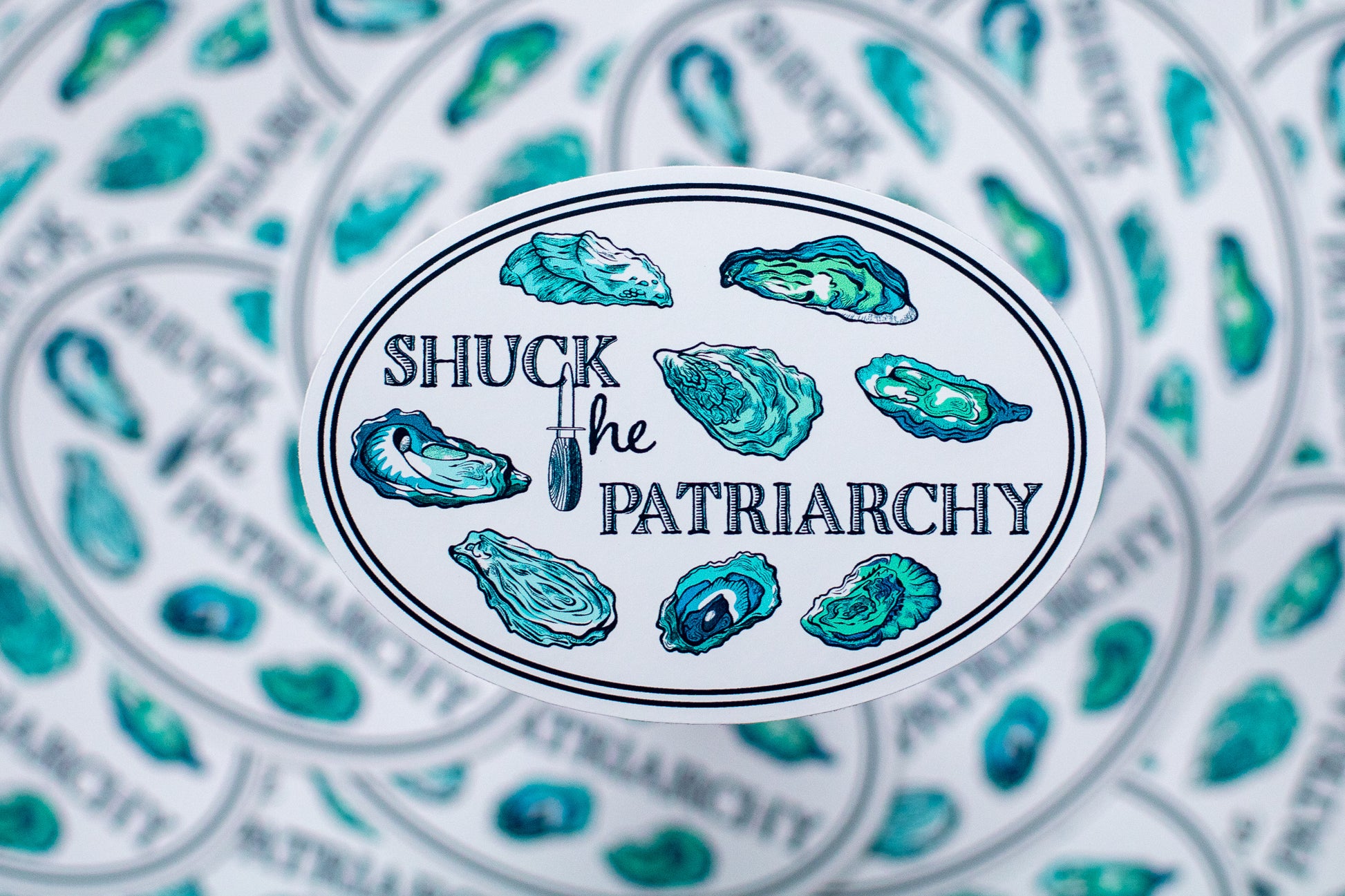 4 inch waterproof vinyl sticker with multicolored oysters and the words SHUCK THE PATRIARCHY. Available in blue, teal, green, purple, orange, and pink. Perfect laptop decal, car bumper sticker, water bottle sticker, etc. A great gift for anyone in your life who wants to tell the patriarchy to "shuck off" without opening their mouths!