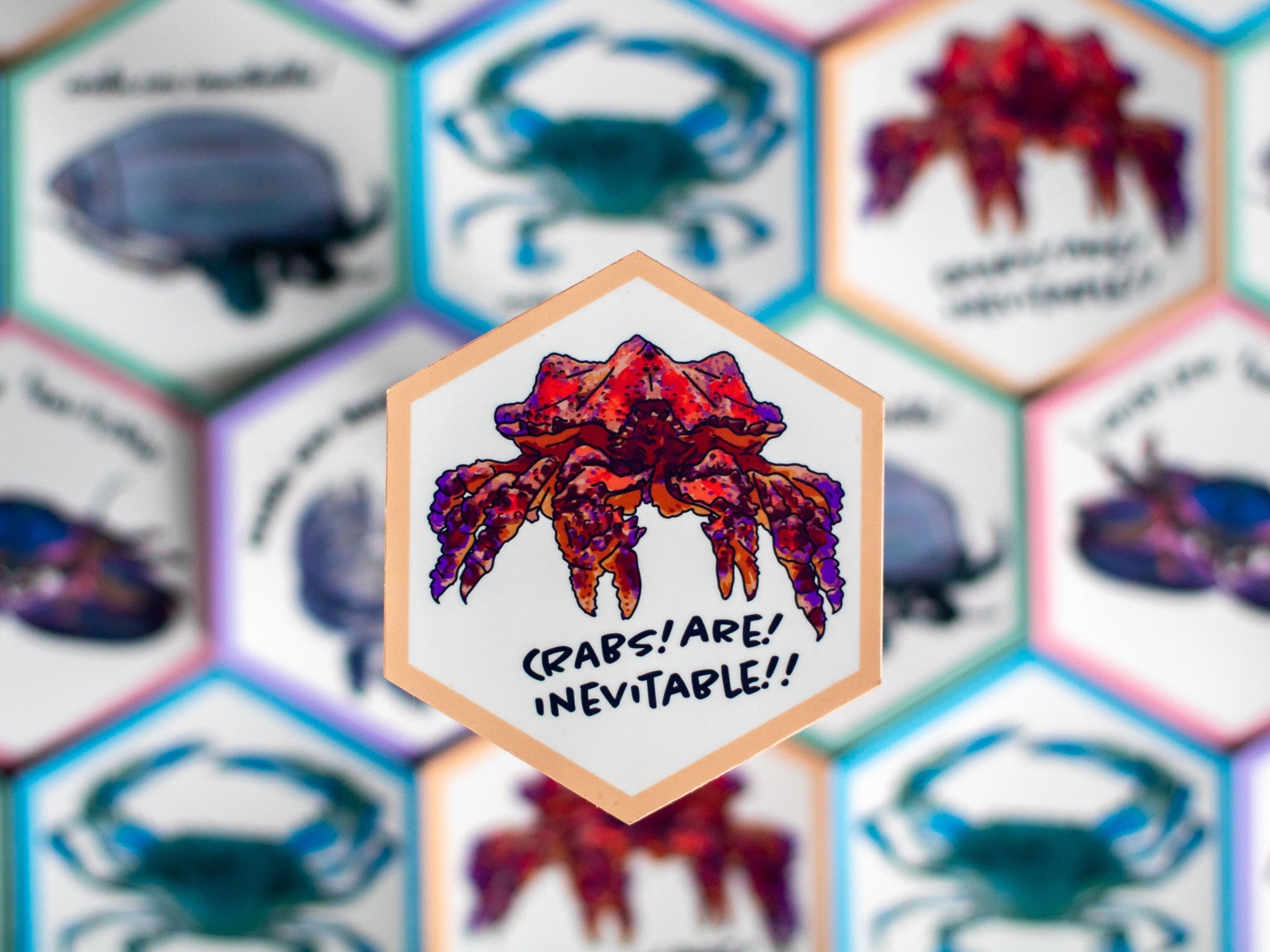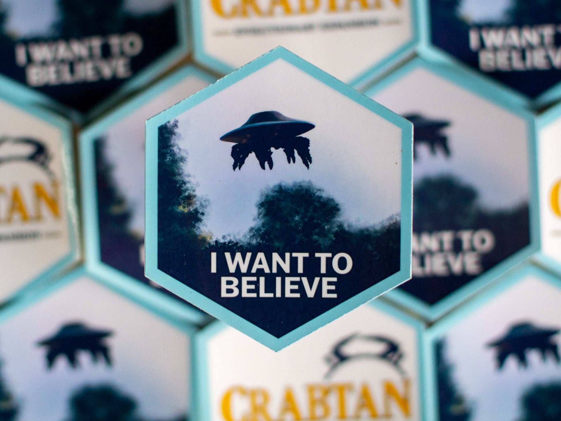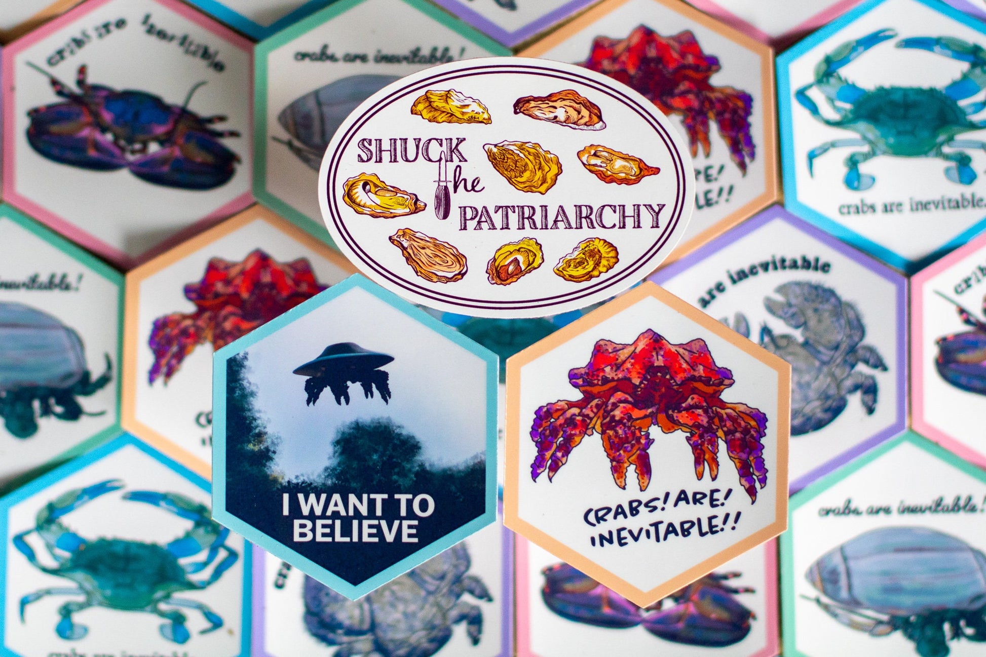 A pack of 3 spooky-themed stickers: two 3.5-inch stickers, one featuring a Puget Sound King Crab and the phrase "crabs are inevitable", and one featuring a UFO with crab legs that reads "I WANT TO BELIEVE", and one 4-inch sticker that says "SHUCK THE PATRIARCHY" (truly the scariest!). Perfect laptop decal, car bumper sticker, water bottle sticker, etc. A great gift for anyone in your life who loves feminism, crabs, oysters, evolution, or supernatural phenomena.